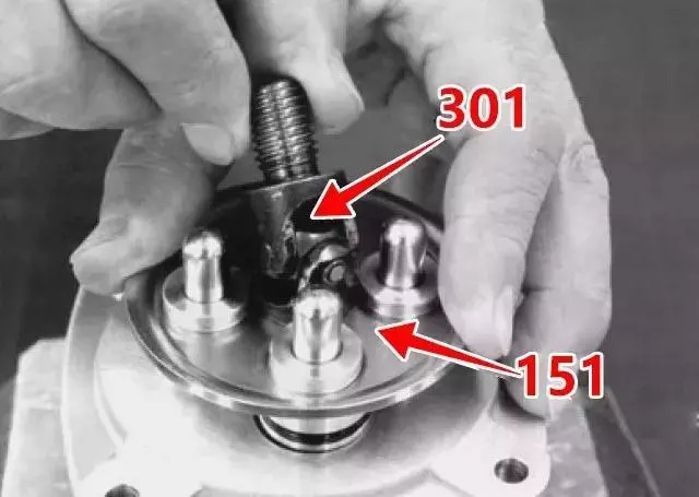 1、在先導(dǎo)閥各端口堵上堵頭后清洗先導(dǎo)閥,拆下防護(hù)罩的同時(shí)用扳手分別卡住調(diào)整螺母(312)和圓板(302),將螺母拆下來后,取下圓板。