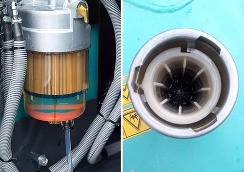 建議每天檢查油水分離中的水分并定期排水。油水分離器中一般有紅色浮標,浮標密度介于柴油和水之間,所以會浮在水面上且處于柴油底部。當浮標處于中間位置時,應擰開油水分離器底部放水螺栓放掉水分。